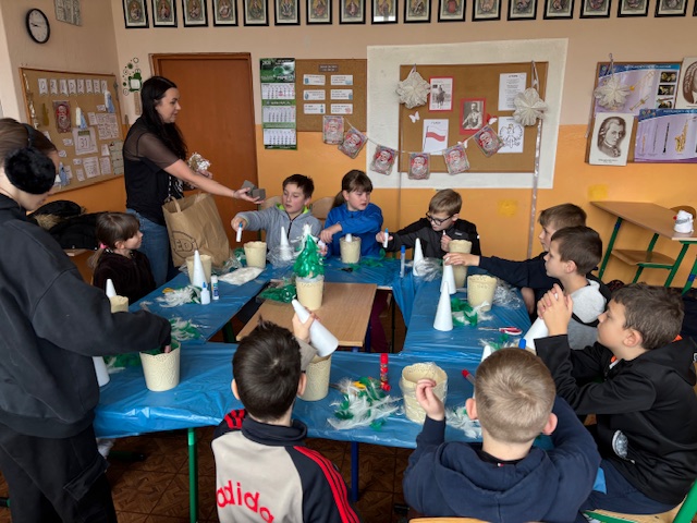 Pod czujnym okiem zaproszonej artystki, pani Małgorzaty Rzempowkiej-Skóry , czwartoklasiści własnoręcznie wykonali efektowne choinki oraz barwne bombki. Pani Małgorzata z ogromną pasją dzieliła się swoją wiedzą, ucząc dzieci różnych technik zdobienia i rozbudzając w nich artystyczną kreatywność.